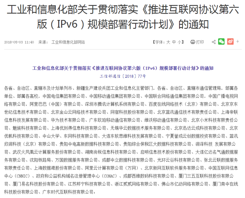 根據(jù)中辦、國(guó)辦下發(fā)的《行動(dòng)計(jì)劃》和工信部下發(fā)的《通知》:2018年末,省級(jí)政府網(wǎng)站,央企網(wǎng)站和新聞媒體網(wǎng)站全部改造支持IPv6;2020年末,市級(jí)政府和新聞媒體和工業(yè)互聯(lián)網(wǎng)應(yīng)用支持IPv6。...