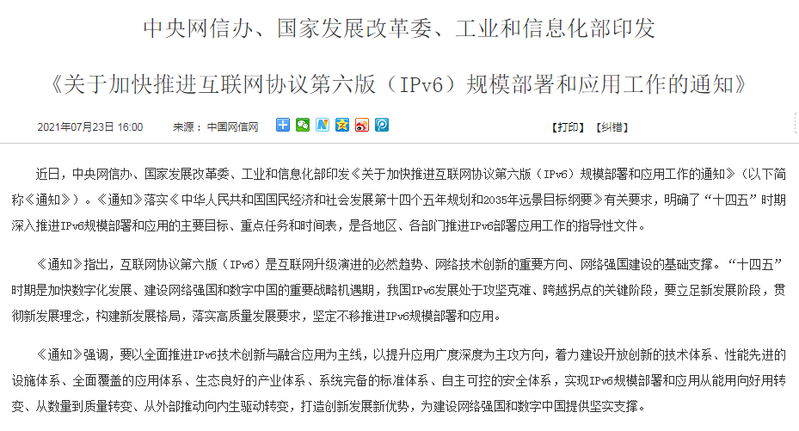 近日,中央網(wǎng)信辦、國(guó)家發(fā)展改革委、工業(yè)和信息化部印發(fā)《關(guān)于加快推進(jìn)互聯(lián)網(wǎng)協(xié)議第六版(IPv6)規(guī)模部署和應(yīng)用工作的通知》(以下簡(jiǎn)稱(chēng)《通知》)?!锻ㄖ仿鋵?shí)《中華人民共和國(guó)國(guó)民經(jīng)濟(jì)和社會(huì)發(fā)展第十四個(gè)五年規(guī)劃和2035年遠(yuǎn)景目標(biāo)綱要》有關(guān)要求,明確了“十四五”時(shí)期深入推進(jìn)IPv6規(guī)模部署和應(yīng)用的主要目標(biāo)、重點(diǎn)任務(wù)和時(shí)間表,是各地區(qū)、各部門(mén)推進(jìn)IPv6部署應(yīng)用工作的指導(dǎo)性文件。《通知》指出,互聯(lián)網(wǎng)協(xié)議第...