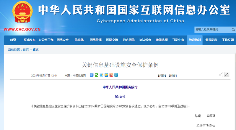 中華人民共和國(guó)國(guó)務(wù)院令第745號(hào)《關(guān)鍵信息基礎(chǔ)設(shè)施安全保護(hù)條例》已經(jīng)2021年4月27日國(guó)務(wù)院第133次常務(wù)會(huì)議通過(guò),現(xiàn)予公布,自2021年9月1日起施行。總理 李克強(qiáng)2021年7月30日關(guān)鍵信息基礎(chǔ)設(shè)施安全保護(hù)條例第一章 總 則第一條 為了保障關(guān)鍵信息基礎(chǔ)設(shè)施安全,維護(hù)網(wǎng)絡(luò)安全,根據(jù)《中華人民共和國(guó)網(wǎng)絡(luò)安全法》,制定本條例。第二條 本條例所稱(chēng)關(guān)鍵信息基礎(chǔ)設(shè)施,是指公共通信和信息服務(wù)、能源、交...