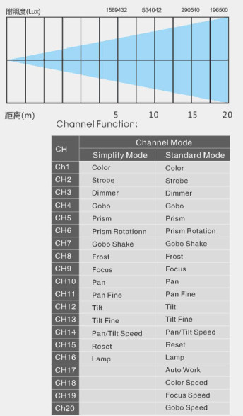 Color System: Color Wheel: 14 + Open, rainbow effect GOBO:17+Open static Gobo wheel