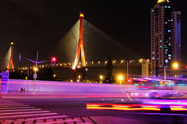 Under the light of the light, the Shanghai Yangpu Bridge is like a rainbow across the river, up to 208 meters of the tower column like a sword pierced the blue sky, numerous rows of neatly cable-stayed cable as if a huge harp wind The Full bridge design compact, sleek shape, constant light dozens of high power searchlight to create a magnificent sense of magnificent, like a rainbow across the river, is the famous landscape of Shanghai tourism.