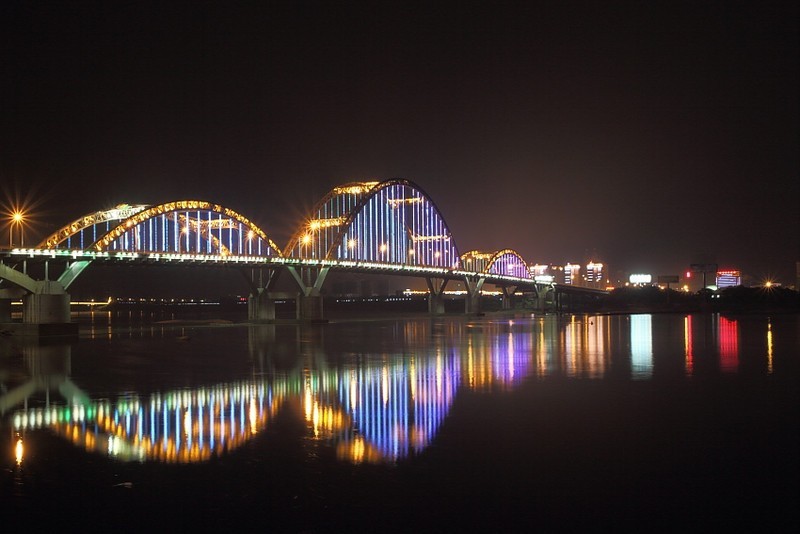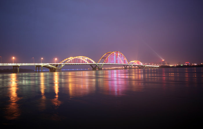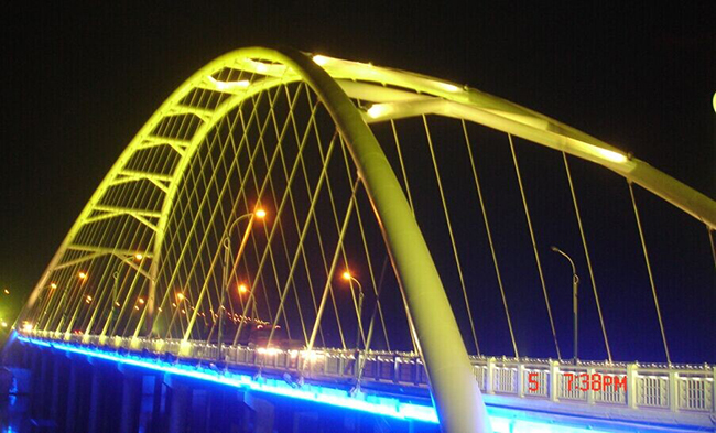 主橋長536米,寬28米;主跨188米,矢高58米,東西次跨各138米,矢高28米,邊跨各36米。大橋橋路總長2627米,其中主、引橋長1744.9米,東西引道長882.1米。大橋設計荷載為汽車——超20級,橋下為三級航道。全橋建設總投資2.9億元。該橋的裝飾燈光主要采用廣州恒之光提供的戶外LED 全彩投光燈,洗墻燈產品,亮度好,壽命長,節能,絢麗的染色效果讓大橋晚上看起來宛如一道醉人彩虹,成為城市特色景觀之一。