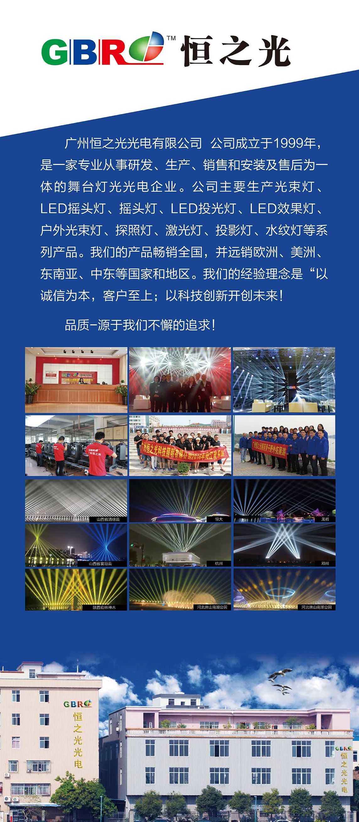 廣州恒之光光電有限公司成立于1999年,是一家專業從事研發、生產、銷售 安裝及售后為一體的舞臺燈光光電企業。公司主要生產光束燈、LED搖頭燈、搖頭燈、LED投光燈、LED效果燈、戶外光束燈、探照燈、激光燈、投影燈、水紋燈等系列產品。我們擁有一批專業的研發,生產隊伍和一個完整售后服務團隊。讓客戶買的放心、用得安心。